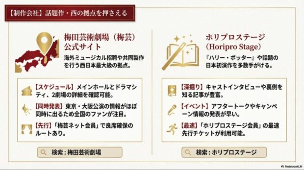 梅田芸術劇場とホリプロステージの公式サイト活用法(スケジュール確認、インタビュー記事、会員最速先行など)の解説スライド。